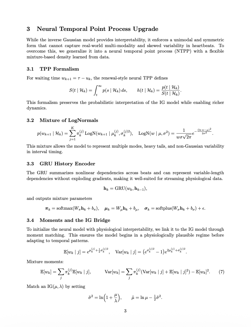 Extended Barbieri’s inverse Gaussian heartbeat model with a mixture-of-lognormals likelihood and GRU dynamics.